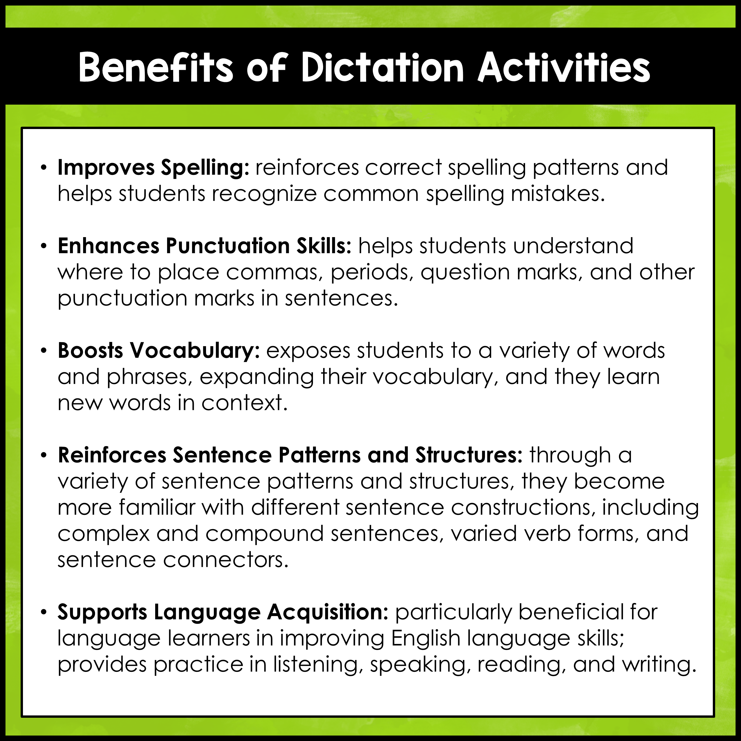 These dictation activities will give students TONS of practice with: