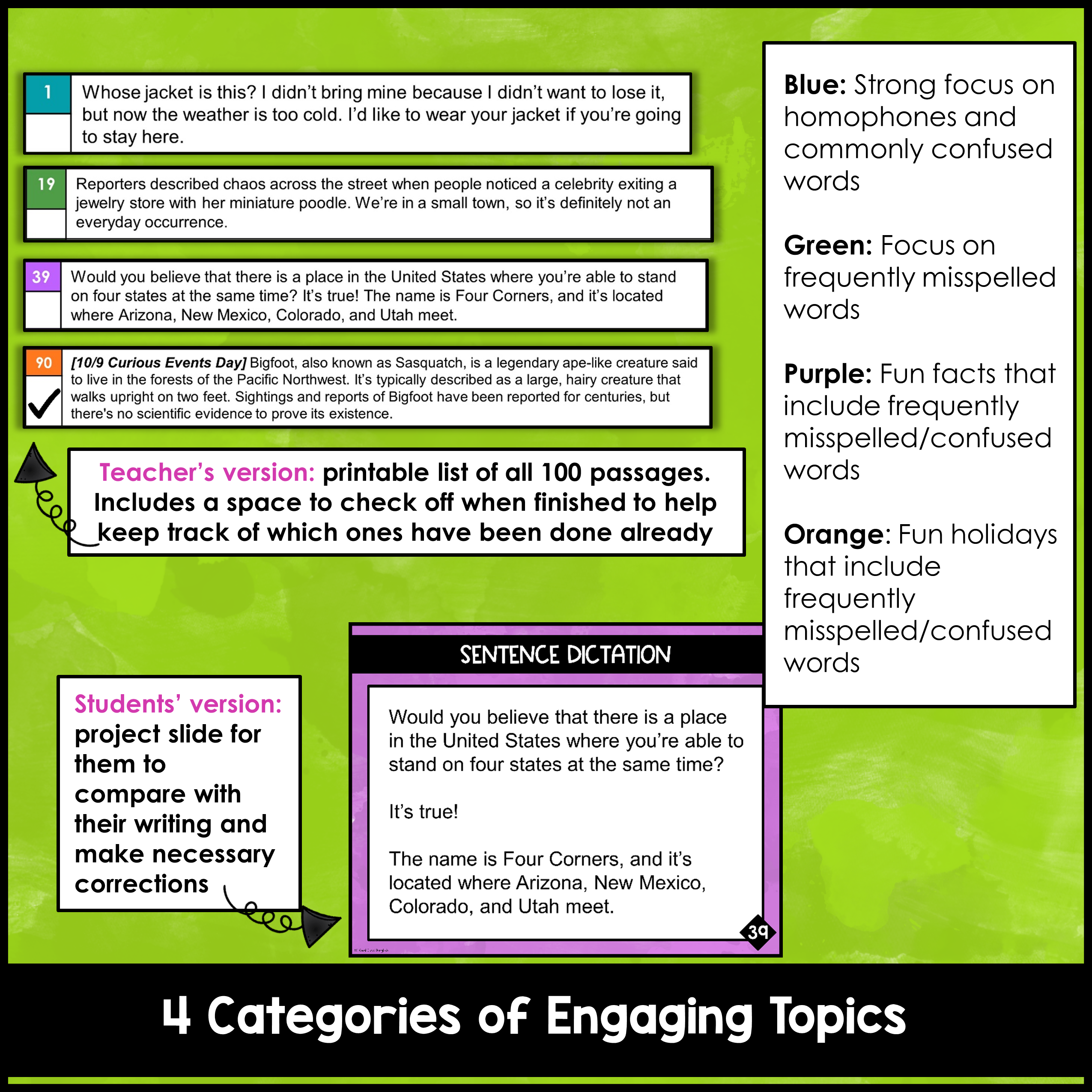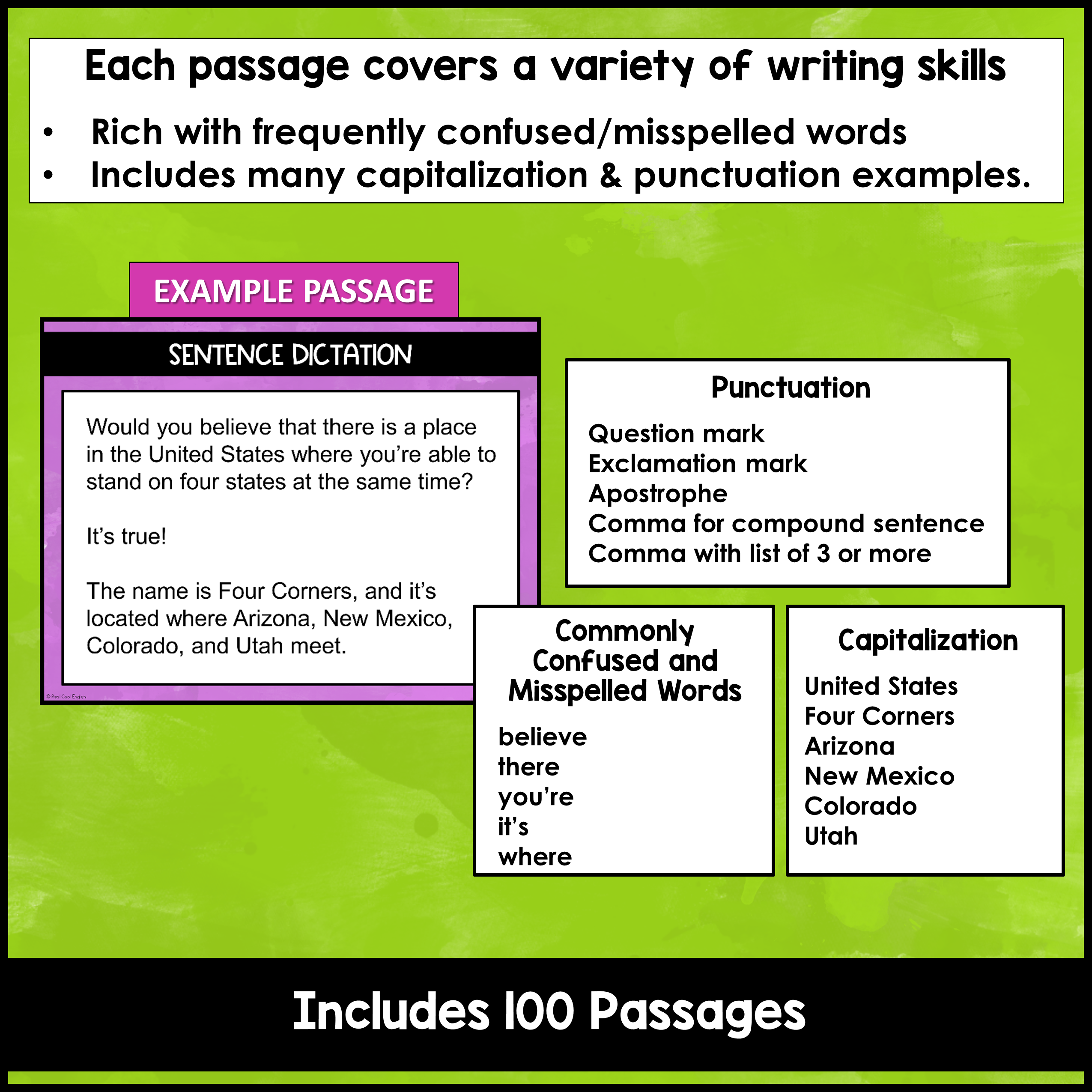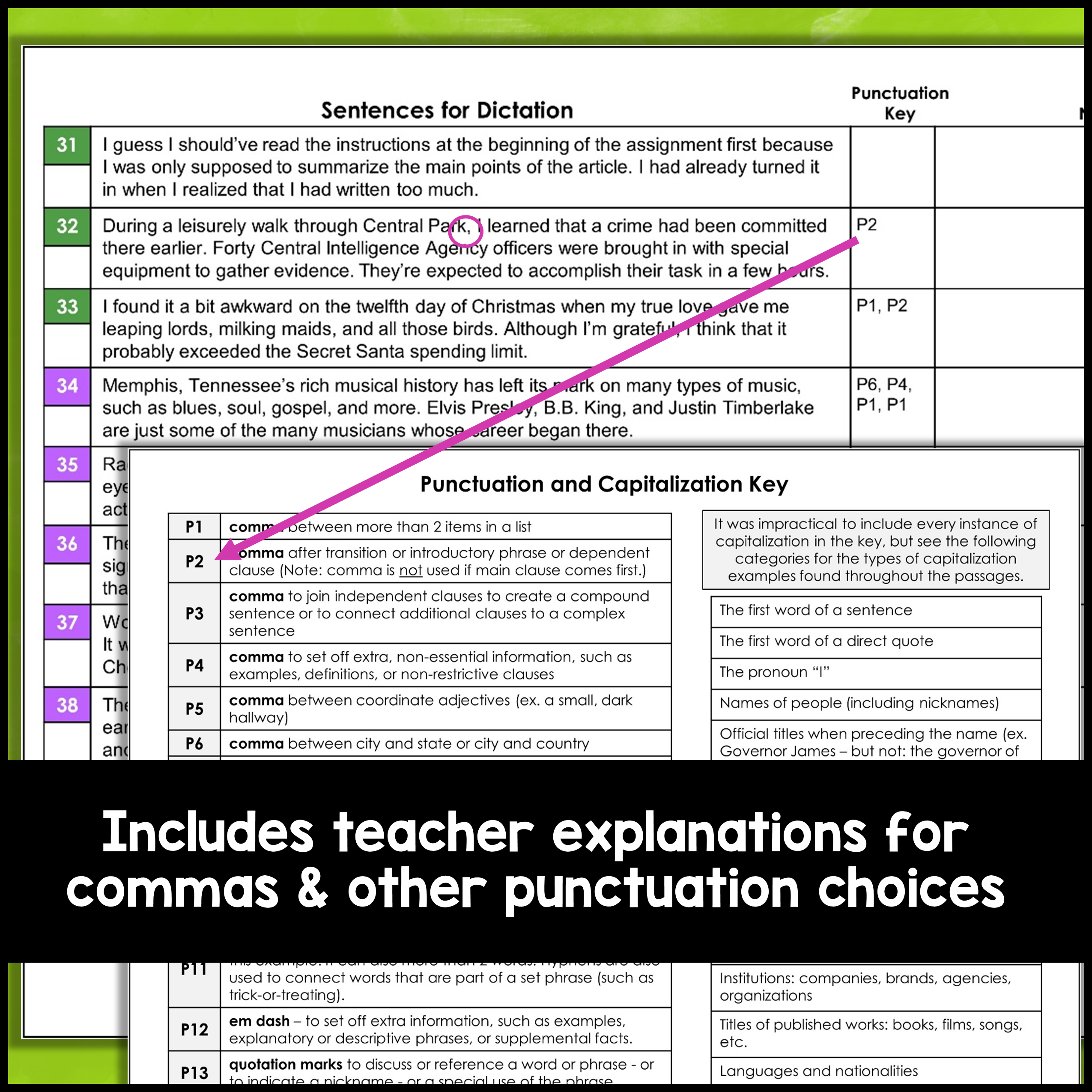 - Teacher copy of passages: a printable copy of all 100 dictation passages and a code for the different uses of punctuation in each