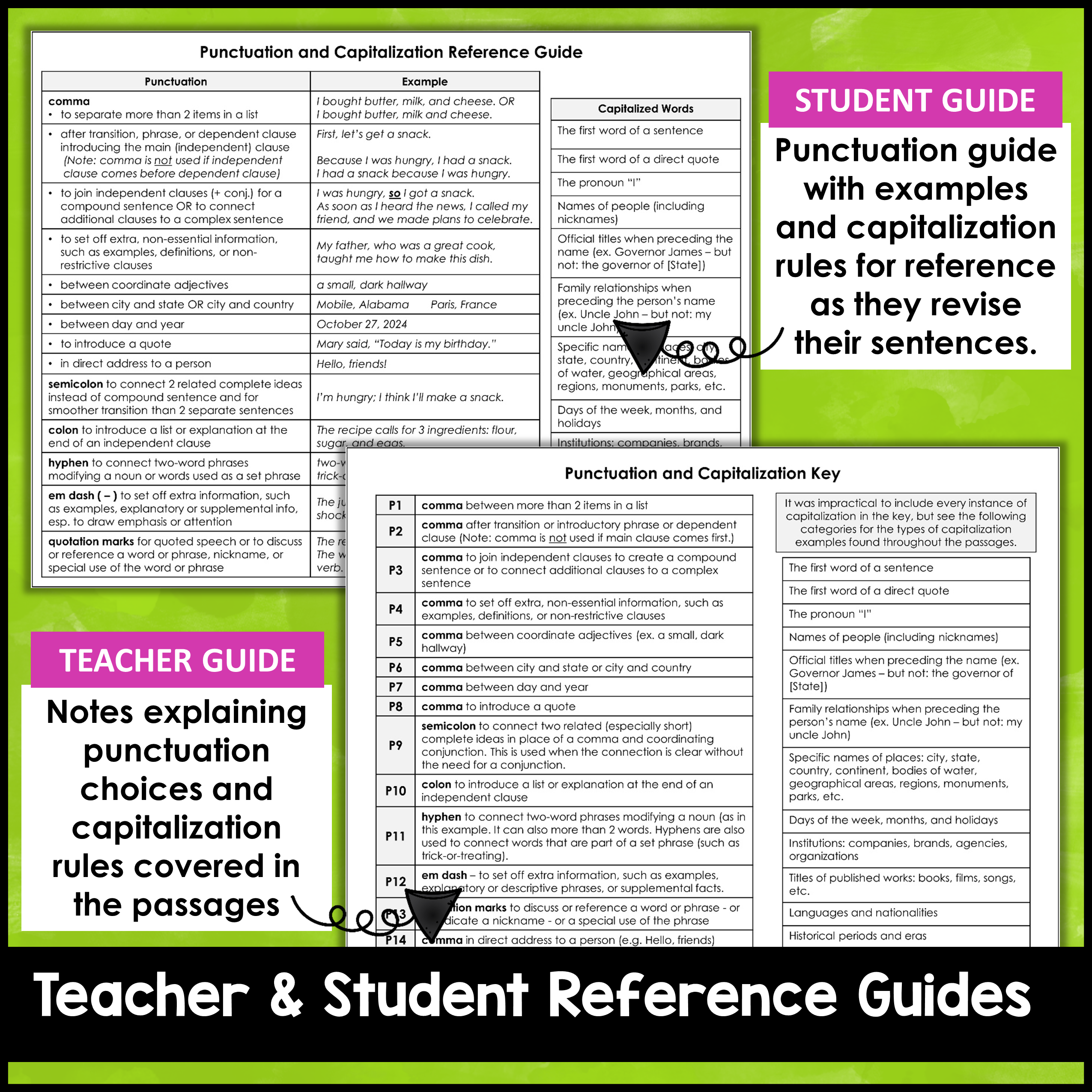 - Student reference sheet: It may be helpful to make this available as they are revising their transcribed sentences as a reminder for capitalization rules and as a guide for using punctuation.