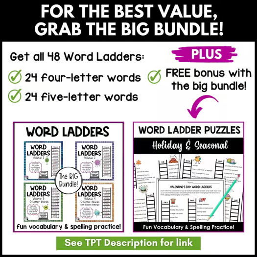 ❤️Love Word Ladders? Add a little festive fun to your classroom with Holiday and Seasonal Word Ladders OR for the best value, grab the Big Bundle, which includes all 48 puzzles PLUS the holiday and seasonal puzzles as a FREE bonus!