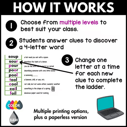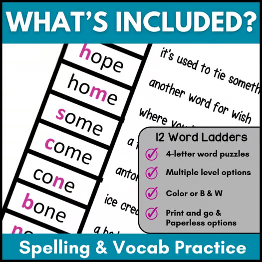 ⭐️ Why use word ladders in your classroom? Puzzles are highly engaging for students, but they also give students plenty of opportunities to build their critical thinking and logic skills. Students can’t get enough of these fun puzzles that also build vocabulary, spelling, and logic skills! For English learners, students are sure to learn some new words, and it’s a great time to go over the pronunciation of the words to show that similarly spelled words can be pronounced in very different ways.